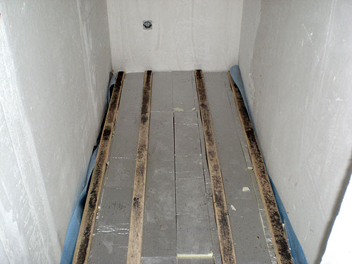 Wie in diesem kleinen Abstellraum zu sehen, werden die aluminium-kaschierten PUR-Wärmedämmplatten zwischen den Bodenlagern verlegt. Die jeweilige Plattenstärke ist aus den Angaben zur Bodenkonstruktion in den Ausführungsplänen zu ersehen. Sie ist davon abhängig, ob der Raum über Erdreich oder beheizten Räumen liegt. Die Plattenstärke reicht im Regelfall von 20 mm bis 70 mm. Auf der Wärmedämmung werden anschließend die Heizrohre mit den Aluminium-Wärmeverteilern aufgebracht. |