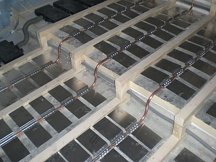 Eine vergrößerte Darstellung der Janßen-FBH im Trockenaufbau: Kupferrohr-Heizschlangen mit aufgesteckten Aluminium-Wärmeverteiler - frei verlegt auf einer aluminiumkaschierten PUR-Dämmung zwischen Lagerhölzern. |