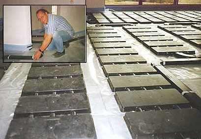 Zu sehen sind Teile der Heizfelder im Wohnzimmerbereich. Die Heizschlangen sind montiert und die Heizflächenabdeckungen mit den integrierten Aluminium- Wärmeverteilern wurden auf diese aufgebracht. Die Vor- und Rücklaufleitungen wurden mit dem Abdeckungsprogramm bestückt. Im Montageablauf folgt nun das Einbringen des Zementmörtels. Dabei werden zunächst die Freiflächen zwischen den Heizflächenabdeckungen und die Randflächen aufgefüllt. Danach wird die gesamte Bodenfläche mit der Estrichschicht versehen. |