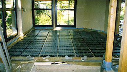 Sie sehen die Janßen - Fußbodenheizung im Nassaufbau. Der linke Teil der Heizflächenabdeckungen ist seitens der Estrichleger bereits mit einem Armierungsgitter für die Einbringung des Zementmörtels versehen worden. Im vorderen Bereich sehen Sie grau / braun die 45 cm - Bögen, welche den Heizrohren in den gebogenen Bereichen später ihre freie Ausdehnung im Boden ermöglichen. |