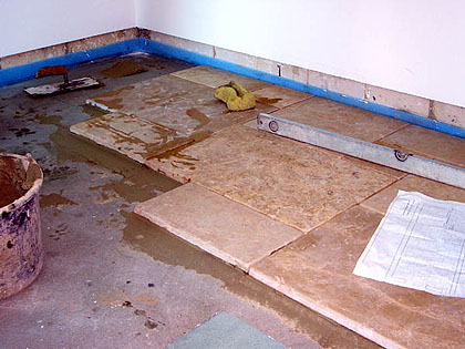 Sie sehen, wie der Bodenleger den Steinboden im späteren Gästezimmer